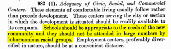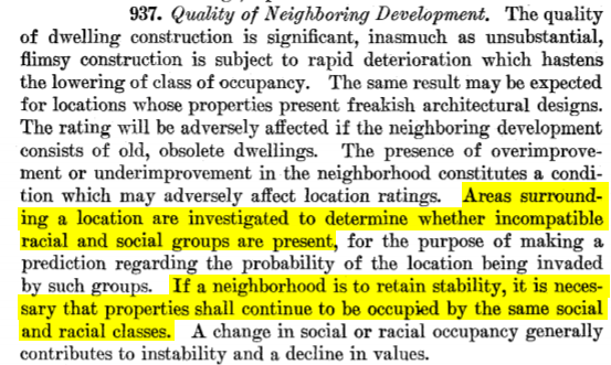 The FHA guidelines for risk assessment went into further detail regarding the risk of “racially inharmonious groups” in a neighborhood and even suggested that residing in a neighborhood where home owners’ children would attend schools with students of “far lower level of society or an incompatible racial element” increases the risk of a loan.