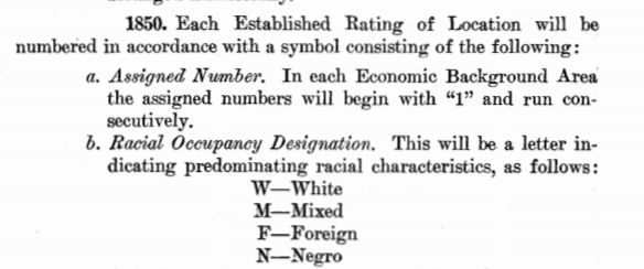 The Racial Occupancy Designations were used in the “Established Rating of a Location,” which were composed of a neighborhood number followed by a letter indicating the primary racial makeup of the population and the property value range (the example in the manual is 28W-7-12-9 which notes that neighborhood 28 is primarily white with houses ranging from $7,000 to $12,000 with the most common price being $9000). The Established Rating was used “as a basis of comparison… with the rating of other locations in the same outlined neighborhood.”